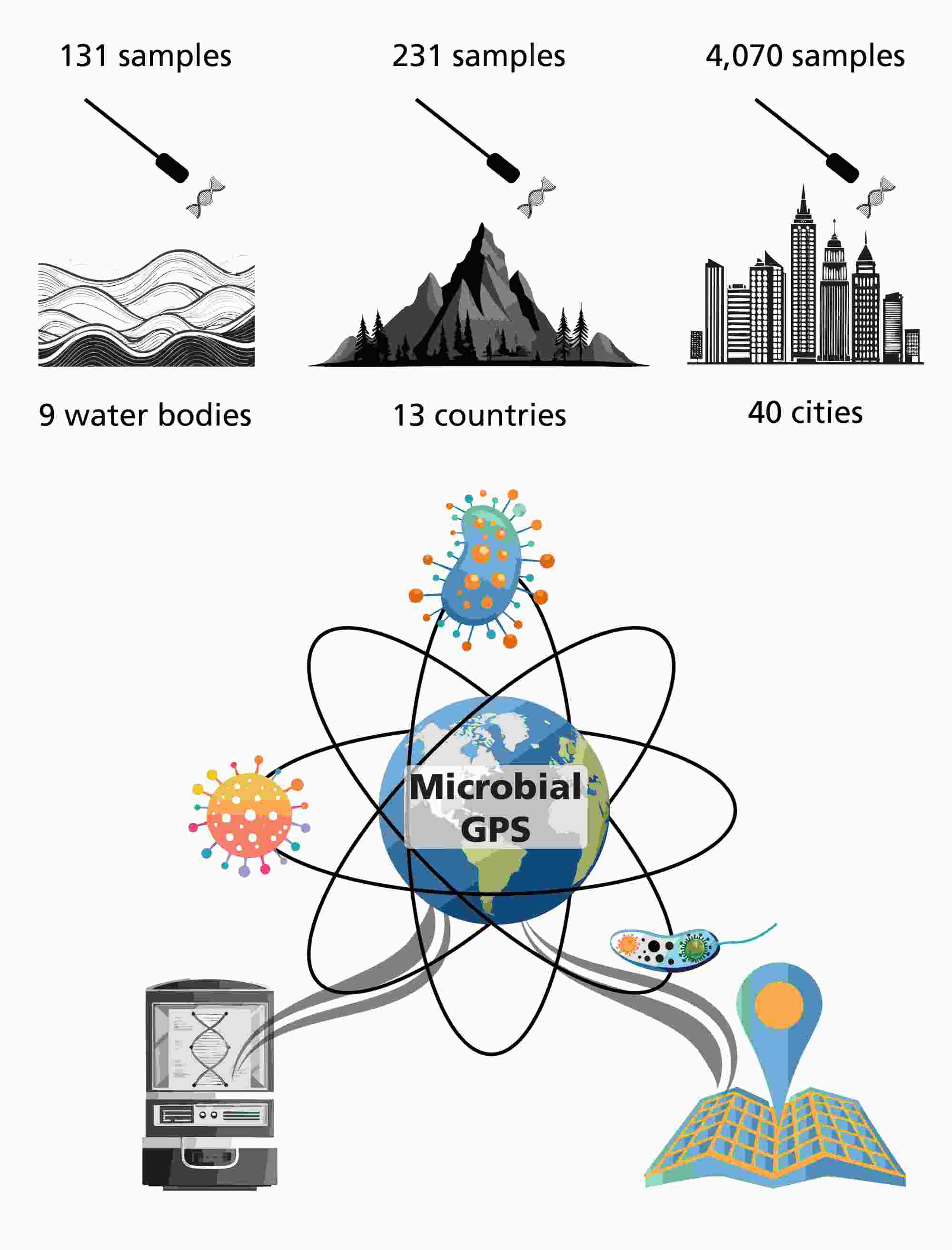 resistance genes. Microbiome geographic population structure's ability to localize samples to their water body, country, city, and transit stations opens new possibilities